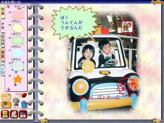 使い方は簡単ですが、CD−ROMにはチュートリアルという詳しく使い方が学べるソフトが付属しています。これを眺めているだけで誰でも使えるようになります。それにサンプルのアルバムも付いていますので編集の参考になります。このようにイラストを入れたり、バックの配色を自由に変更することができます。それに「ふきだし」を入れたり、シールを貼ることができます。 画像の取り込みは、TWAINドライバーを設定することでディジタルカメラからじかに取り込むことができるようになっています。また読み込み可能なファイル形式はbmp,jpeg,gifやフォトCDなどがサポートされています。 録音することもできるので、メッセージを入れたり、画像の説明を付け加えることが可能です。いろいろな機能がありますが、画像を好きな角度に回転させたり、輪郭をぼかしたり枠をつけたりできます。仕上がったアルバムの自動表示や、BGMが流れて華やかな雰囲気を醸し出す演出も楽しめます。 もう一つの特徴は、できあがった作品をディスケットに保存してプレゼントすることができます。結婚式や記念日の思い出などの画像をまとめてメッセージを入れて贈ると、喜ばれること請け合いです。