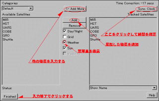 ここでいろいろな変更ができます。表示衛星の追加削除、グリッド表示、それに世界の雲写真の表示ができるのが大変便利です(写真7参照)。アマチュア衛星の表示は「Add More」をクリックして「Default」を「Amateur Radio」に変更して「Add」で追加します。この欄には現在DO-17、KO-23、RS-12/13など7個の衛星が登録されています。