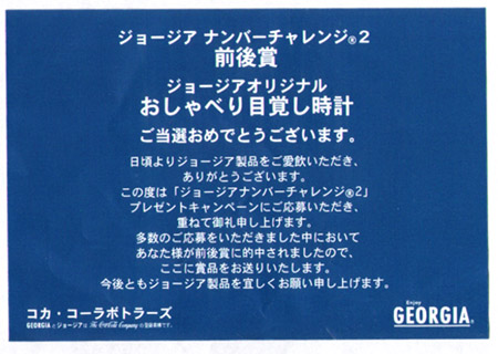 「ジョージア・ナンバーチャレンジ2」で前後賞を当てた景品,