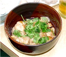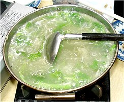小魚杏菜はひゆ菜(杏菜)とシラスの料理です。 料理名は同じでも炒めただけのものとスープ仕立てにしたものがありますがもちろんスープのほうが美味しいです。 台湾ではひゆ菜の一番美味しい食べ方がこれだといわれています。 でも今回のような鍋仕立てははじめてです。 嬉しいですね、こうすると普通のスープ仕立てよりいっそう美味しく感じられます。 ただ、残念なことは使われているシラスが日本のもののようで少々しょっぱいことです。 日本のシラスは釜揚のものでも塩をするのでこれを使うと本当の味が出ないそうです。