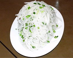 ところで宴会の菜譜ですが、まず前菜は蘇州の家庭料理から脆嫩蘿蔔絲と酒菜の二品を選択しました。 脆嫩蘿蔔絲は中華版大根サラダといったところであっさりしたしあがりになっています。 酒菜は野菜を紹興酒につけて作る一風変わった冷菜です。 陳皮、山椒などがアクセント加え複雑な味わいをかもし出しておりなかなかにいけてました。