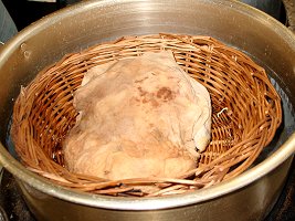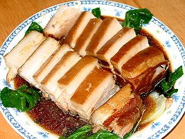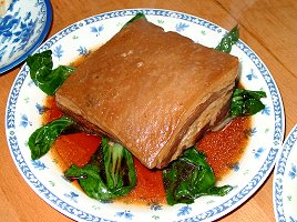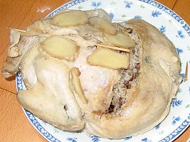 今回予約したものは風鶏と東坡肉です。さて、お題の風鶏ですが、私が知っているのは揚州料理のちょっと燻製っぽい味のする、風にさらした鶏の料理です。これは、詰め物などはせずに鶏肉そのものを食す料理です。この店のものは棗、クコ、金華(火腿)その他をあえたもち米をつめて蒸しています。