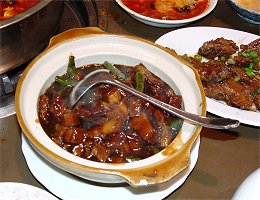 この店は鍋だけでなく醤鶏、香菜干絲などの上海系家常菜(家庭料理)も水準以上で充分に満足できると思います。 変わったところでは、皮付きの豚肉を四季豆(インゲン)と一緒に土鍋煮にした毛氏家郷肉(毛沢東好みの豚肉)も結構楽しめます。 濃厚な味の茶色のソースで煮こまれていますが、この味洋風でちょっと気になります。 似たような味で思い出すのは関内の中国食堂の東北菜「ジャガイモと豚の角煮」です。 この店の味はあまりお勧めではありませんがこの料理に関しては結構気に入っていたりします。