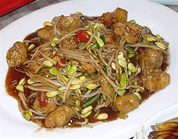 水晶魚凍は英語でFish Jellyと書いてあったにもかかわらず出てきたものはトコロテンの親戚のようなものでした。 黒醋で味付けした固めのトコロテンといったところでしょうか。 どう考えても魚は使われてはいないように思えるのですが謎ですね。 でもこういったものを食すと焼酎のお湯割を飲みたくなるのは私だけでしょうか。