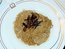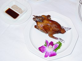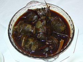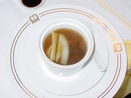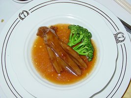 水晶蟹膏はゼリー状の物体の上に蟹味噌がのっています。 小姐に聞いてみると肉皮凍だというのですが、食べてみると緑豆粉としか思えません。 調理場に聞いてきてもらったところ、やはり、緑豆粉でした。 内心、肉皮凍だと面白いのにと思っていたのですが、残念でした。