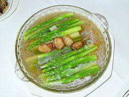菜胆花姑燉花[月交]も良かったです。 特に干し椎茸の質の良さには驚きました。 よく素食では鮑を椎茸で代用すると言われているのですが、もう一つピンときませんでした。 ここの物を食して見ると、噛み応えと言いねっとりと歯に貼りついてくる感触と言い十分鮑の代用となること、理解いたしました。