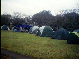 フライ3張り、雨でも問題なしのキャンプサイト お池遊園での設営風景。ドームテント6張り。