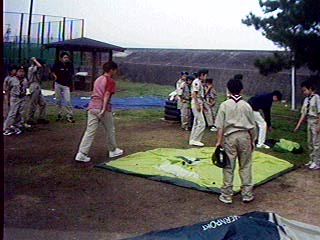 前回のキャンプで濡れたテントを干しながら、ソング・基本動作・ロープワーク・手旗など行なった。