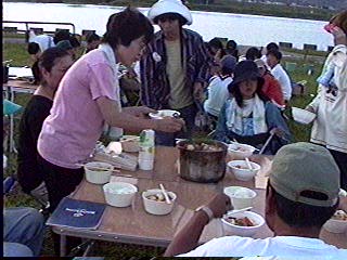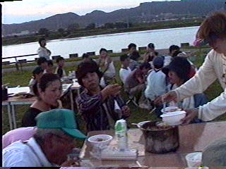 大会初日平日のせいか参加指導者は私一人なので、保護者会の皆さんに参加してもらい、 本番に備えて、夕食作りを練習してもらった。 風の影響で家で準備するようにはいかなかった。