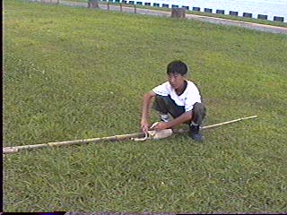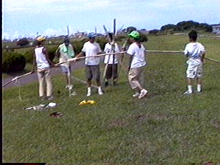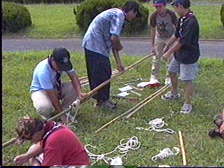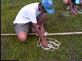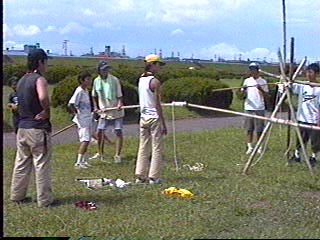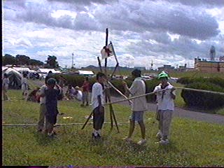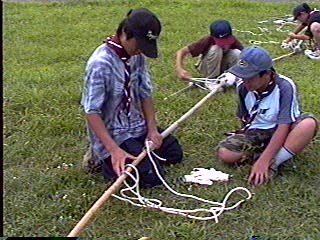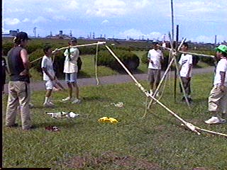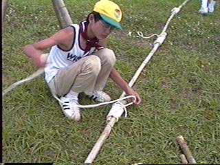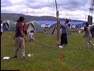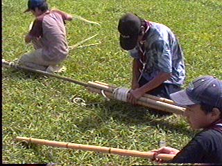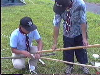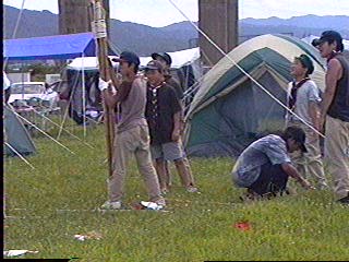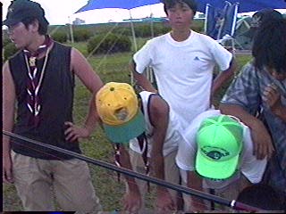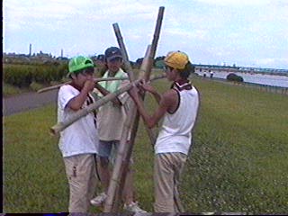 小嶋班長班と西林班長班に別れ、競争した。2mの竹を4本継ぎ班旗を立てるのだ。計5本キャンプサイトの設営はバッチリだ。 手前右は私のベッド。結構いけてる。 鈴木SCですよ