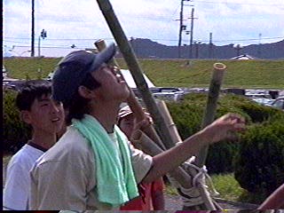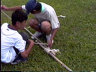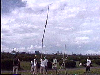 ゆっくりと立てていくと竹がしなってきて結び目から音がして...... 何とか大丈夫だ!
