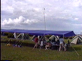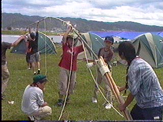 これは前回(県大会・地区大会)もそうだが、与えられる敷地が班活動単位( 住居と食堂フライ)でくれず、必然的に共有部分利用になってしまう。 対策として、常時使用の家型テントを止め、ド−ムテントを張り、共有部分の面積を広く取ることにし、 20b・24bの敷地に設営できる事を確認した。
