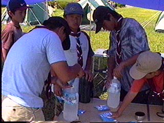 集合してきたスカウトから氷を集めて、クーラーへ 氷代が高いから各家庭で作ってきてもらった。