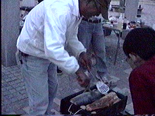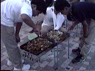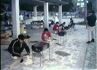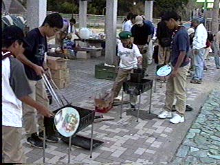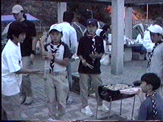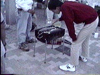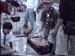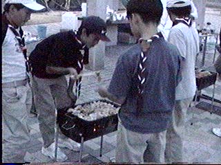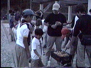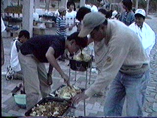 班長達は豚キムチ・ウインナ−・ホタテ・海老・イカ焼き・焼き鳥・焼きそば等を担当した。