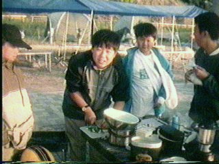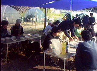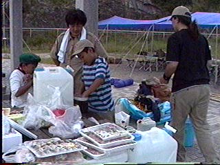 朝食準備もてなれている川北班長。 渋谷班長が味噌汁を.....岡野ホークス班元班長が指導に.↑