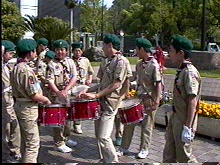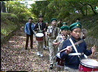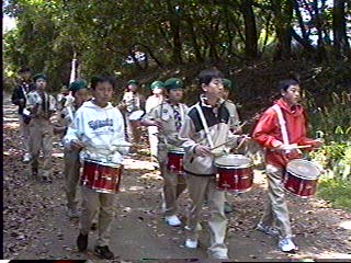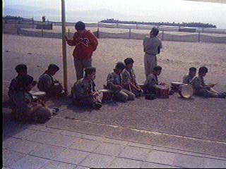 片男波で鼓隊の練習をするスカウト達