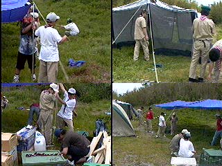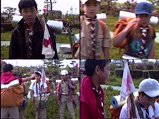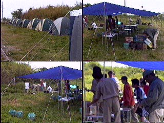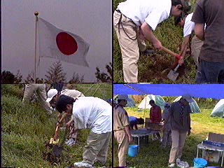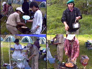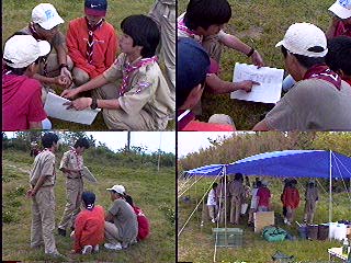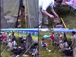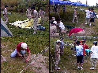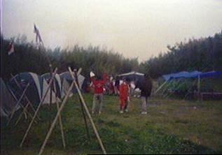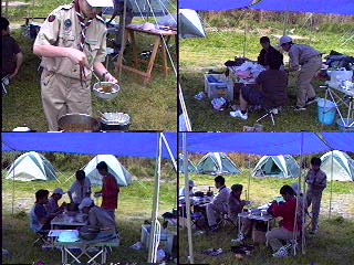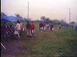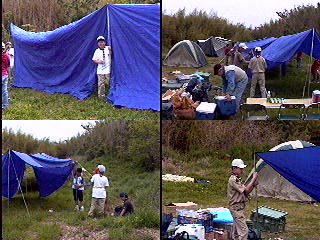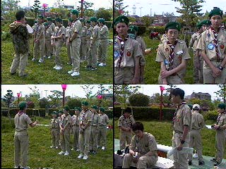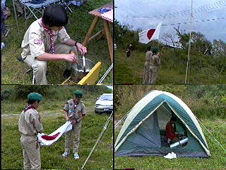 開会式を..当番班はコンドル班だ!中原班長頑張れ! 国旗掲揚とソング(連盟歌)をおこなった。又、すぐに昼食を済ませ、 設営を開始。天気はだんだんと曇って急いで全員で食堂フライを張った。