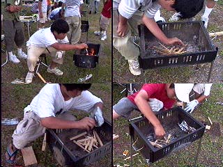 伝統の火起こしゲームが始まった。班長たちが次長達を指導できているか..... (笑)