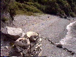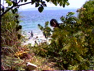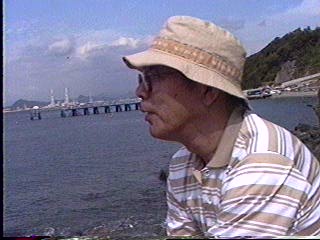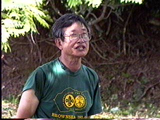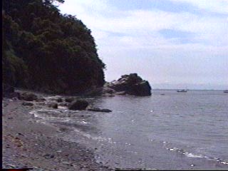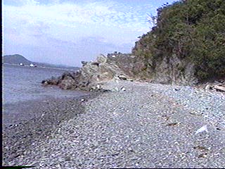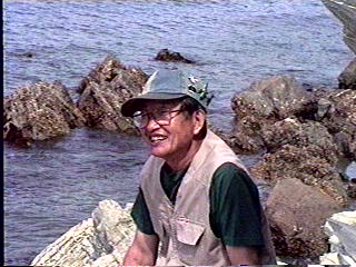 全体の広さが全く把握できない状態だった。海岸から広場(バレーコート附近)を見上げる。 亀岩よりキャンプ場の前の海岸を 一本松 昔はこの岩に松が生えていた。 亀岩 亀の形をした岩だから..... 昔を語る北畑団委員長 同じく昔を語る岩井需品部長