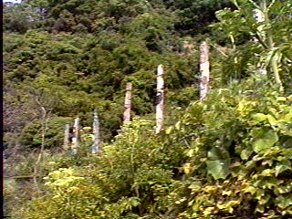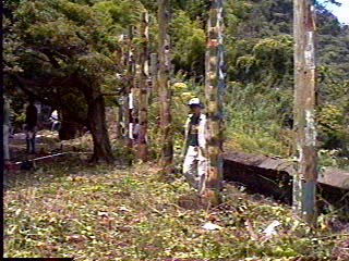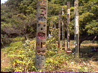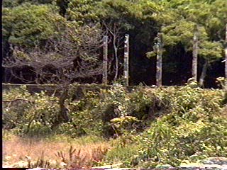 右側が広場(バレーコート)です。朽ち果てた看板 トーテムポールが見える。 広場付近 (バレーコート)左側が海岸で右側が山。
