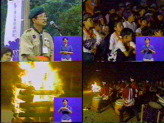 キャンプファイヤーで火を入れる北畑野営長 第1クールに参加した岩崎SC ↑バンダナ