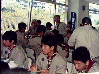 入所式後、夕食をすませ、夜のプログラムに参加。屋台形式で各隊 別に夜店をだして、充分楽しんだ。 部屋割りは、GBとそれ以外に 別れたが、GBは指導者と同室のためハメはずせず残念!
