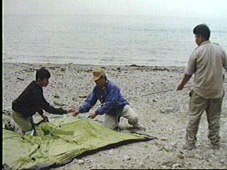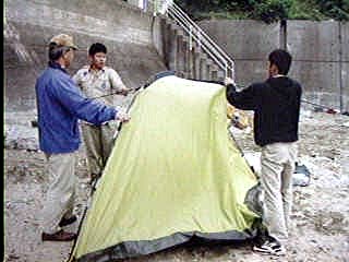 和田班長と山田班長がドームテントを張って。 宮崎班長と辻次長と岩出君に張り方を教えて。