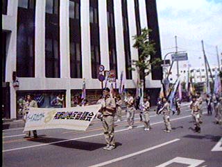公園前をパレード 大岩上班が地区横幕をもって行進。