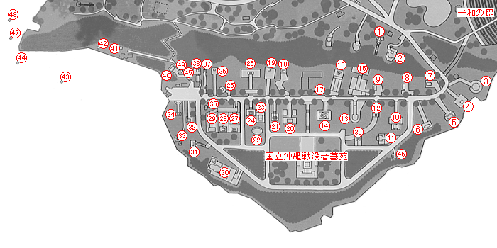 園内には国立沖縄戦没者墓苑を中心とし、各都道府県、自治体、遺族会などの慰霊碑が数多く建立されております。