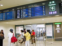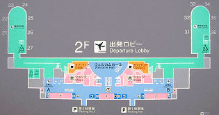 2階は主に出発ロビーとショッピングモールです。 到着口と同じく左手の「A出発口(20番台搭乗口)」と右手の「B出発口(30番台搭乗口」に分かれています。 到着口と同じく、おおむね「A」がJAL系列、JAS系列で「B」がANA系列の便、となっていますが、搭乗口が20番台と30番台に分かれているので、それほど混乱することはなさそうです。 |