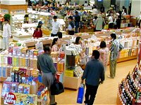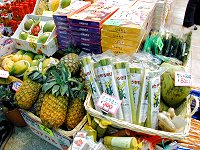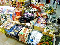 旧ターミナルでは、いわゆる土産物屋は、スペースの関係でそれほど充実しているとはいえませんでした。 しかし、新ターミナルとなって、売り場面積の拡大にしたがって、およそ本島内で売られている土産のほとんどは空港で手に入るといっても過言ではないと思われます。 青果、菓子類、酒類、アクセサリー類を始め、ありとあらゆるものがそろっており、当然のことながら、書店、薬局、銀行も完備されています。 |