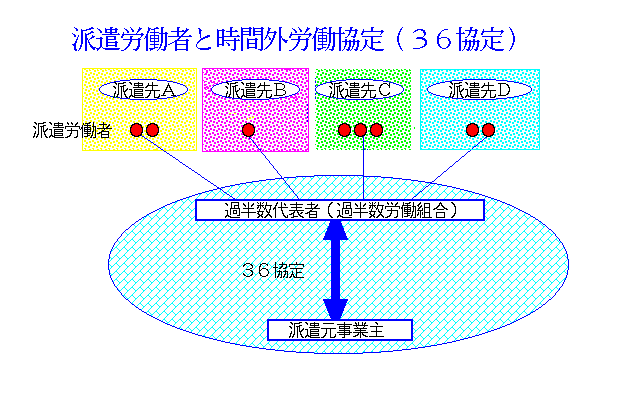 私の派遣元会社には労働組合があり、会社と組合で36協定(残業協定・時間外労働協定)を結んでいます。しかし、その協定の範囲を超えた場合は個々の労働者から個別に36協定の申請をさせています。「なぜ36協定を個々で終結するのか」といった問いに対し、「36協定には取り決めるべき事柄について何も規定していないから、組合と「個々で終結出来る」といった取り決めをしているのでそれで良い。」といった回答でした。