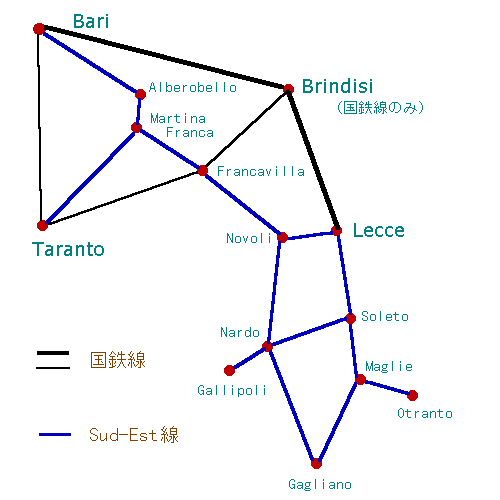 Novoli,Soleto,Maglie,Nardなどの分岐点では、自分の乗っている車両がどっちへ向かうのか、乗り換えは必要ないか、必ず確認した方がよい。