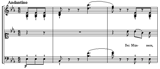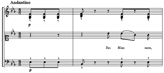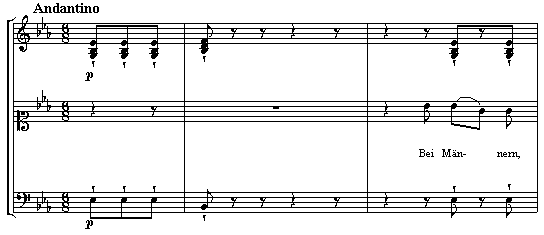 モーツァルトにとって単純な3/8拍子や、そして単純な繰り返し拍子グループ形成は、あきらかに、いずれにせよ、ここで見た作品において、拍節上の拍子グループ形成を持った6/8拍子とは作曲法上異なったヒェラルキーに位置付けられている。二重唱の経過部に続く「男と女、女と男(Mann und Weib und Weib und Mann)」にて動きが3/8拍子と6/8拍子の間を揺れるように見える。そのときしかし、そこで、パートナーの一人、すなわち女王の娘パミーナが「神(Gottheit)」の言葉を目前にして、また「神に至る(reichen an die Gottheit an)」の発言の豊かな自覚において、我を忘れて音楽的にいわば突然感情を爆発させる。この瞬間に、動きは「より高い」6/8拍子においてもはや単なる単純な繰り返しではなくて拍節法に規定された拍子グループ構築法により安定化する。パパゲーノはそれに反し、3/8拍子のまま、その単純な繰り返しのまま取り残される。