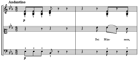 | 2 | Arnold Feil, Mozarts Duett "Bei Männern, welche Liebe fühlen". Periodisch-metrische Fragen, in: Festschrift Walter Gerstenberg zum 60. Geburtstsg. Hrsg. Georg v. Dadelsen und Andreas Holschneider.Wolfenbüttel - Zürich 1964, pp.45-54. (アーノルト・ファイルはテュービンゲン大学教授であり新シューベルト全集編纂者でもある) |