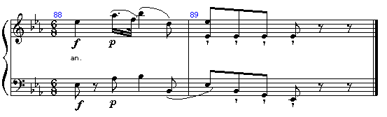 表から分かるのは、草稿においてはうわべの6/8拍子と本当の6/8拍子が必ずしも同位相でないということである。すなわち実小節65-68(経過部)は記譜小節と同位相だが、実小節84-90(終止部)は記譜小節と同位相でないのである(ファイルはこのことを考慮に入れていない)。これは、3/8拍子の小節数がこの間(第2部)で奇数であることによる。従って終止部の実小節は図4の如くなる。