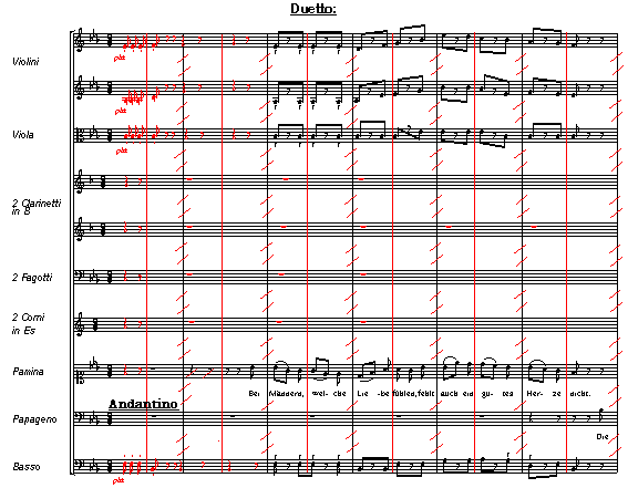 | 16 | Horst Seeger, Die Originalgestalt des Es-Dur-Duetts Pamina/Papageno in der Zauberflöte in: Beiträge zur Musikwissenschaft Jg.1963 p.66では小節線をずらした理由を「終止の基本和音の確認が長すぎるとして見直しを行い、彼のバランス感覚によりこの曲における拍子、いわゆる音調学が修正を要求した」ためとしている。 |