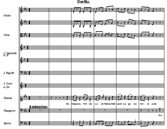 パパゲーノの世界から始まったこのリートの様な二重唱は、―パミーナがその「音」でパパゲーノの方を向いたのだが!―パミーナの高い「アリア風の音」で終わる。しかし、それと共に規定しなければならない作曲上の問題の最も重要な克服方法は、「音」の変更あるいは変化よりも、むしろリズム領域の作曲法である。つまり、拍子タイプと拍子グループ構成である。この作曲作品の後ろには民族音楽における比較可能なリズム現象がずっと残される。より正しくいえば、比較可能な現象にあちこちで出会うことは事実である。