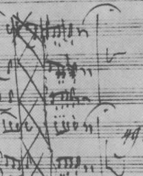 | 17 | Arnold Feil, 1964. op. cit. p.49においては「人はモーツァルトが4分休符の上に小節線を追加書きし、見直さなかったと推定するであろう。しかし、モーツァルトは(後から消されることになる小節線のうち最初の)小節線を、3/8アウフタクトのうしろの小節線を消すことなく消すということはできなかった。なぜならこの時点において彼は3/8拍子による表記を考えていたからである」とArnold Feil, 1991とは異なった見解を述べていた。 |