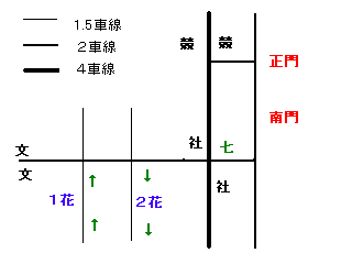 正門=競馬場正門 1花=「花園町」バス停(市内循環1コース) 2花=「花園町」バス停(市内循環2コース) 文=「文化センター入口」バス停 七=セブンイレブン 競=「競馬場前」バス停 社=「社会保険事務所入口」バス停 ↓↑=矢印方向へ一方通行 |