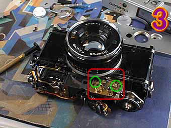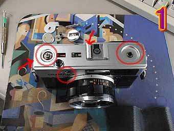 1の写真の赤丸部分の巻き上げレバー、巻き戻しレバー、セルフタイマーと矢印のネジを外すとトップカバーが2の写真の様に外れます。 jazzyさんの質問のレンズボードの外しかたを解説します。2の写真の赤部分のネジを2個所外しますとガイドナンバーノブが一式外れますと3の写真のようになります。 |