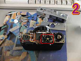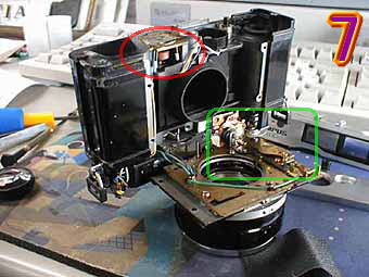 7の写真です。赤丸の部分は、メーターになります。6の写真の緑の部分と結合してくわえ込み式のEEメーターになります。メーターブロックが下部にあるカメラは珍しいと思います。ほかのカメラよりこの点では35DCは故障が多くなる率が増えます。緑部分は、シャッターボタンとシャッターチャージブロックになります次に8の写真の赤丸部分は、距離計連動ピンになります。このピンの押し引きにより距離計像を動かすわけです。 | ![]() |