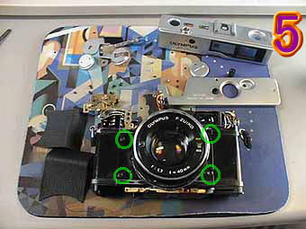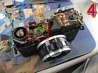 次に3の写真の赤部分のセルフタイマーユニットを外します。緑丸のネジを2個所外すとセルフタイマーユニットがごそっと外れます。ただ1つのネジがシャッターボタンの下にありますので注意して外してください。 次に4の写真の緑丸の部分のネジを外します 。これがレンズボードが外れなかった原因の隠しネジです。私も始めは見つけるのは、大変でした。なんでこんなところにあるのでしょうか?ちなみに4の写真の赤丸部分は、巻き上げとチャージのリンクをつかさどるギアです。 |