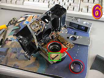 次に5の写真の緑丸のネジをレンズボードから外しますとレンズボードが外れます。逆さにして外してください。この時断線には、注意しましょう。5の写真のまわりには、外した部品の1式がありますので御参考までに。 次に6の写真です。jazzyさんのはまらなかった後群のレンズが簡単にはまると思います。ちなみに緑部分はメーター針がここにはまりくわえ込み式のEEとなるわけです。 |