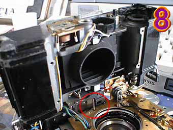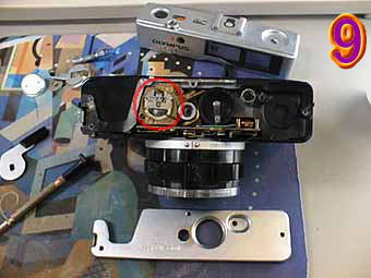 ![]() | 9の写真は、35DCを下部から見たものです。赤丸は、7の写真で言ったようにメーターになります。コンパクト化の為こんな位置につけられています。苦労のあとがうかがえます。再度組み立てをおこなって完成です。ちなみにセルフタイマーはもとからありませんでした。(ジャンクですから(^^))jazzyさん健闘を祈りますなにかありましたらまたメールでよろしくお願いします。 | ![]() |