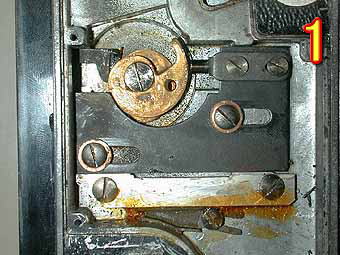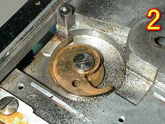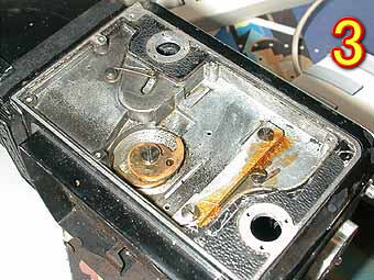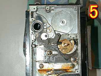 今回は、アイレスフレックスZの分解です。繰り出し部がペコペコして焦点の合わない時の修理です。まず写真1ですが、巻き上げ部の逆面のカバーをあけたところです。これが2眼レフの繰り出し機構になります。構造的には簡単なものですが精度を出すのはかなり難しいと思います。写真2は繰り出し用の勾玉カムを拡大したところです。先ほど言ったとおり両面を同じ位置に合わせ込むのは非常に難しいと思います。この勾玉カムは分解しないほうが無難です。といってもなかなか簡単にはネジは緩んではくれませんが。 | ![]() |