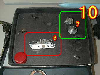 写真9は、細かい部品です。赤枠の4は、巻き上げノブ関係の部品です。銀色の部品にある穴が自動巻き止めの解除ピンが入る穴です。 緑枠の5は、繰り出し部の部品です。 写真10も細かい部品たちです。赤枠の6は、裏ブタ止めの部品です。 緑枠の7は、フィルム固定用のノブです。 他にもネジがたくさんあります。 |