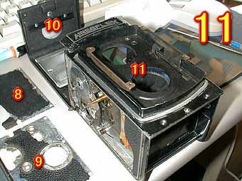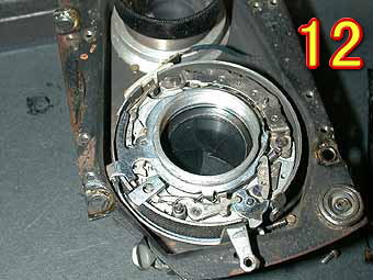 写真11は、大きな部品たちです。8と9は側面カバーで、10は裏ブタ、11は本体ブロックになっています。 写真12は、シャッターブロックです。シャッター内部が見えるように分解してあります。このアイレスフレックスZはワンレバー式なので少々凝ったシャッター構造をしています。よくシャッターチャージ止めの切り抜きが経年劣化で削れてしまいシャッターチャージがかからなくなったりチャージリングの回りにつく連動部品がかけたりすることのトラブルが多いと思います。 |