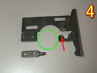 写真3は、繰り出し板を外したところです。下にガイドレールがありここで水平を出しています。たいていは古いグリスがべったりとついていてかなり汚れています。このグリスが繰り出しの動きを悪くする原因です。写真のほうは清掃がすんだあとです。 写真4は、今回の故障となった繰り出し板です。緑丸部分が勾玉カムが密着する部分です。赤矢印の部品が変形して勾玉カムの上にいってしまいペコペコして焦点があわなかったわけです。この部分を慎重に戻してあげて繰り出し部分の修理は完了しました。 |