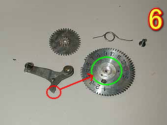 次に自動巻き止め機構の修理です。写真5は巻き上げ部側のカバーを開けたところです。当然勾玉カム付近の清掃をして再グリスアップをしてあります。巻き止め部の部品は外れています。 写真6は巻き止め部とカウンターです。赤丸部分が経年劣化により削れてしまい巻き止めの不良になっていました。この部分を削って歯が出る様にしました。緑丸部分に切り抜きがあってそこにひっかかることにより巻き止めを行うようになっています。 |